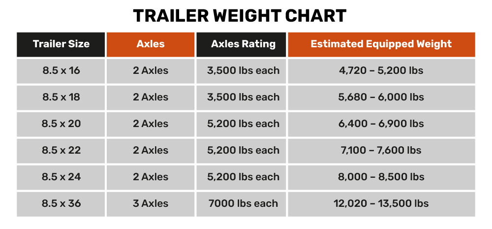 Trailer weights are estimates and may vary depending on equipment and layout. Always confirm your vehicle’s towing capacity before towing your unit.